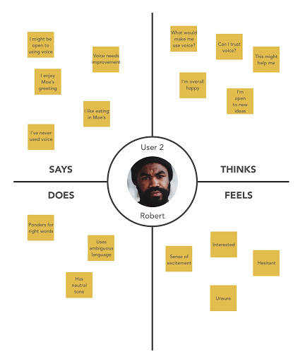 As we compiled our resources, we also realized we needed some firsthand experience in a Moe’s restaurant. While we had all eaten there at some point in the past, we had never actually observed and codified the interactions customers experience there. So, we conducted a formal observation session of a Moe’s restaurant nearby. We spread out to different parts of the restaurant and tracked any notable interactions customers engaged in over the course of an hour. Then we regrouped, organized our findings, and did an onsite brainstorming session where we tried to imagine any and all ‘areas’ of Moe’s that a voice interaction could fit in. The obvious answer was for online ordering, but since our prompt was so open-ended, we wanted to approach it from every possible angle and leave no potential stone unturned. The results of this brainstorm were documented but didn’t actually come into play until much later in the project when we designed our participatory design workshop.